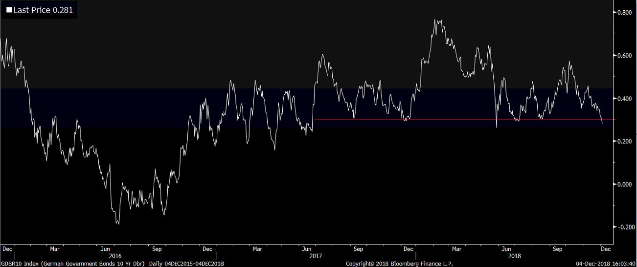 Pokles výnosov z dlhopisov nie je len americký fenomén. Týka sa väčšiny krajín a dôvodom sú obavy o pomalší rast globálnej ekonomiky, ktorý sa prenáša na očakávania, že centrálne banky budú odkladať zvyšovanie úrokových sadzieb. A to aj ECB. Výnosy z Nemeckých dlhopisov klesli pod support pri 0,3% a obchodujú sa na úrovniach z polovice roka 2017. Ešte v septembri pritom siahali na 0,6%.