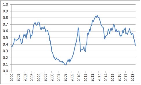 Tento index zaznamenal v posledných štyroch mesiacoch prudký pokles. Aktuálne je najnižšie od leta 2011 a vzhľadom na silno negatívne momentum to vyzerá, že ešte môže ísť ešte nižšie.