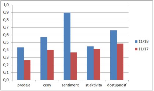 V porovnaní s minulým rokom sa zhoršili všetky ukazovatele. Najviac klesal sentiment (kvôli prepadu cien akcií staviteľov domov), výraznejšieho poklesu sa dočkal aj vývoj predajov, cien a dostupnosti bývania. Relatívne stabilná zatiaľ ostáva stavebná aktivita, hoci aj tá mierne klesla.