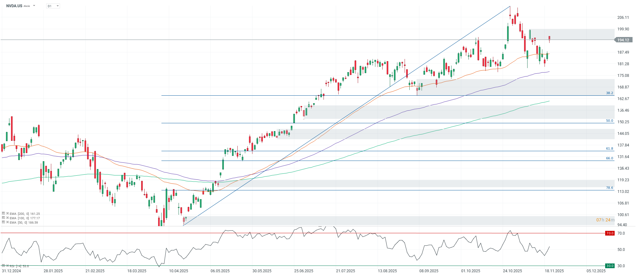 Americké akcie vo štvrtok výrazne posilňujú. S&P 500 pridáva zhruba 1,6 %, Nasdaq 100 okolo 1,9 %, ťahaný spoločnosťou Nvidia, ktorá po silnom výhľade tržieb rastie približne o 3,5 %. Kôš Magnificent Seven pridal viac než 2 %, nahor mieria aj Alphabet a Meta.