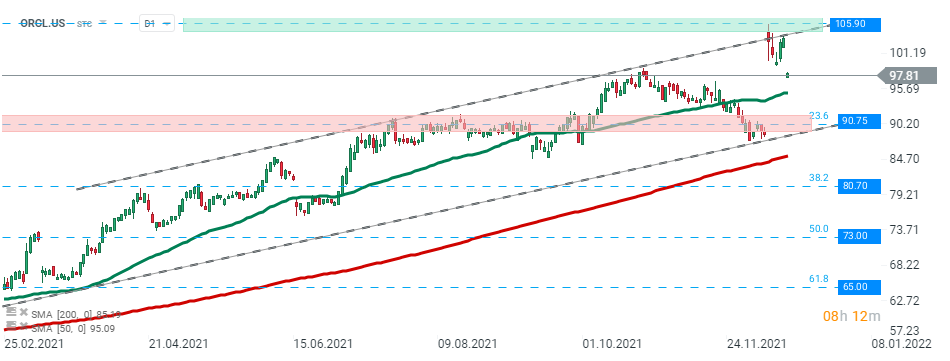 Akcie spoločnosti Oracle (ORCL.US) sa od marca 2020 obchodujú v rastúcom trende. Nedávno sa dokonca cene podarilo preraziť nad hornú hranicu vzostupného kanála a dosiahnuť nové historické maximum vo výške 105,90 USD. Tento pohyb sa však ukázal ako krátkodobý a cena zaznamenala pokles. Akcie začali dnešnú seansu nižšie po správach o akvizícii a ak prevládne súčasný sentiment, pohyb smerom nadol sa môže zrýchliť smerom k lokálnej podpore, ktorá sa nachádza na hodnote 90,75 USD, ktorá sa zhoduje s 23,6% Fibonacciho retracementom vzostupnej vlny začatej v marci 2020 a spodnou hranicou vzostupného kanála. Zdroj: xStation5
