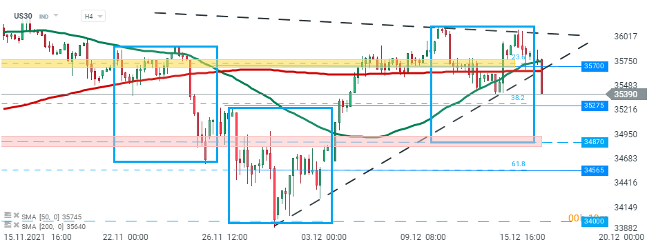 US30 zahájil dnešnú seansu výrazne nižšie a prelomil sa pod vzostupnú trendovú čiaru. Ak prevládne súčasný sentiment, klesajúci impulz môže otestovať hlavnú podporu na úrovni 35275 bodov, ktorá je posilnená o 38,2 % Fibonacciho retracement vzostupnej vlny začatej v októbri 2020. Ak by došlo k prelomeniu pod túto úroveň, ďalší cieľ pre medvede sa nachádza na úrovni 34870 bodov a je označený spodnou hranicou štruktúry 1:1. Zdroj: xStation5