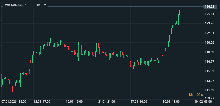 Akcie Walmartu sa počas obchodovania vyšplhali nad 126 USD, čo umožnilo prekonanie magickej hranice. Investori ocenili rastu tržieb, efektívne riadenie nákladov a digitálnu modernizáciu obchodného modelu. Zdroj: xStation5