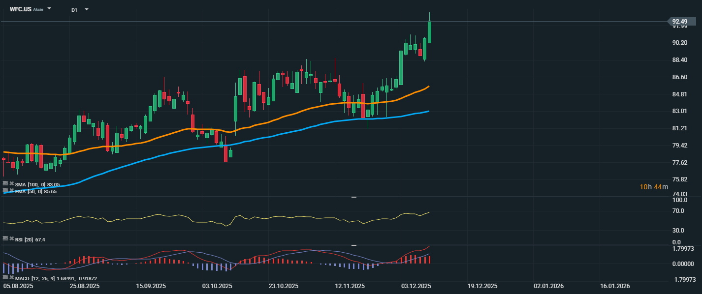 Akcie Wells Fargo aktuálne dosiahli úroveň 92,49 USD, čo predstavuje nové lokálne maximum a potvrdenie silného rastového trendu. Cena prerazila vyššie po niekoľkých týždňoch konsolidácie a zostáva výrazne nad kĺzavými priemermi – EMA 50 (85,65 USD) a SMA 100 (83,05 USD), čo je silný býčí signál. RSI sa nachádza na hodnote 67,4, čo ukazuje na silné nákupné momentum, no zároveň upozorňuje na blížiacu sa zónu prekúpenosti.