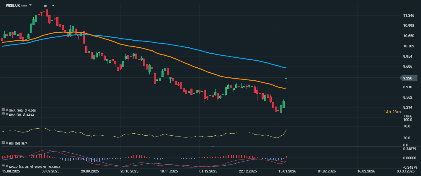 Akcie spoločnosti Wise Plc sa po dlhšom klesajúcom trende dostávajú do pozitívnejšieho technického nastavenia. Aktuálne sa obchodujú na úrovni 9,22 GBP, pričom prerazili nad kĺzavý priemer EMA 50 (8,88 GBP), čo môže byť prvým potvrdením obratu trendu. Najbližším výraznejším odporom je SMA 100 na úrovni 9,57 GBP, ktorá sa nachádza len mierne nad aktuálnou cenou. RSI dosahuje hodnotu 58,7, čo naznačuje zlepšujúce sa momentum bez známok prekúpenosti, teda priestor pre ďalší rast stále existuje.