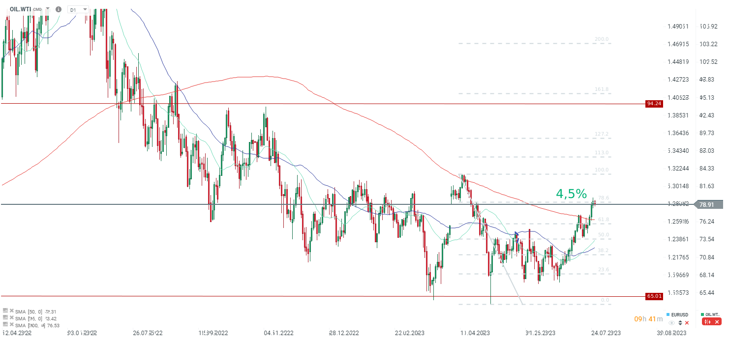 Po prelomení 200 SMA bol pohyb smerom nahor približne 4 %. Napriek tomu sa zdá, že súčasný pohyb by mal byť o niečo väčší ako toto menšie prerazenie, a to vzhľadom na predchádzajúce masívne poklesy a fundamentálnu situáciu, v ktorej je ponuka pomerne silno obmedzená. Navyše, ak bude dolár opäť prepredaný, pohyb smerom nahor by mohol dosiahnuť až 85 USD za barel, kde by pohyb o 10 % klesol z úrovne 200 sma. Zdroj: xStation5