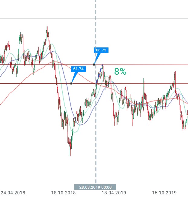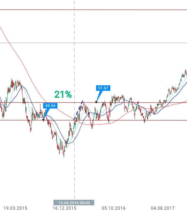 V apríli 2016, po dlhom klesajúcom trende, ktorý nasledoval po prelomení 200 SMA, bol pohyb smerom nahor až 21 %, napriek tomu sa cena následne dostala do konsolidácie zhruba v rozmedzí 43 - 52 USD za barel. K začiatku dlhšieho pohybu smerom nahor však došlo až o 1,5 roka neskôr. Zdroj: xStation5