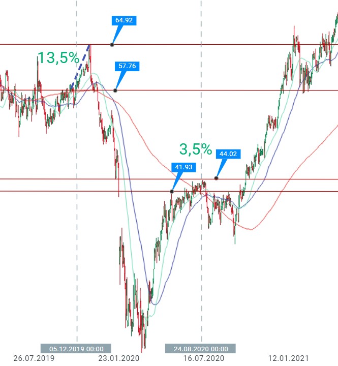 Koncom roka 2019 došlo k prerazeniu z už spomínanej konsolidácie a cena potom vzrástla približne o 13,5 %. Potom sa však cena prudko posunula smerom nadol, čo súviselo s Covidom. Neskôr v auguste 2020 došlo k menšiemu prerazeniu 200 SMA na úrovni 3,5 %. Nasledovala krátka konsolidácia ohraničená zhora hodnotou 44 USD a potom sa začala dlhá rastová vlna. Zdroj: xStation5