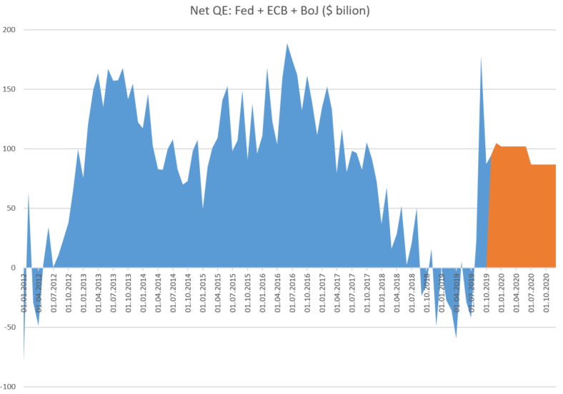 Okamžitá reakce se bude soustředit na tečkový graf, ale v průběhu tiskové konference by dotazy mohly směřovat a rostoucí rozvahu banky, kterou Fed začal opět navyšovat. Nejmenuje se to tentokrát kvantitativní uvolňování, nicméně jedná se o formu "tištění peněz", které proudí do ekonomiky. Takže po krátké přestávce pumpují opět tři důležité centrální banky (Fed, ECB, BoJ) nové peníze na trh. Fed se soustředí na krátkodobé dluhopisy a nákupy by zatím měly trvat do poloviny roku 2020. Jakékoliv zmínky o prodloužení tohoto termínu budou trhem vnímány jako holubičí signál. Opět by se jednalo o negativní signál pro USD a pozitivní pro zlato a akcie.