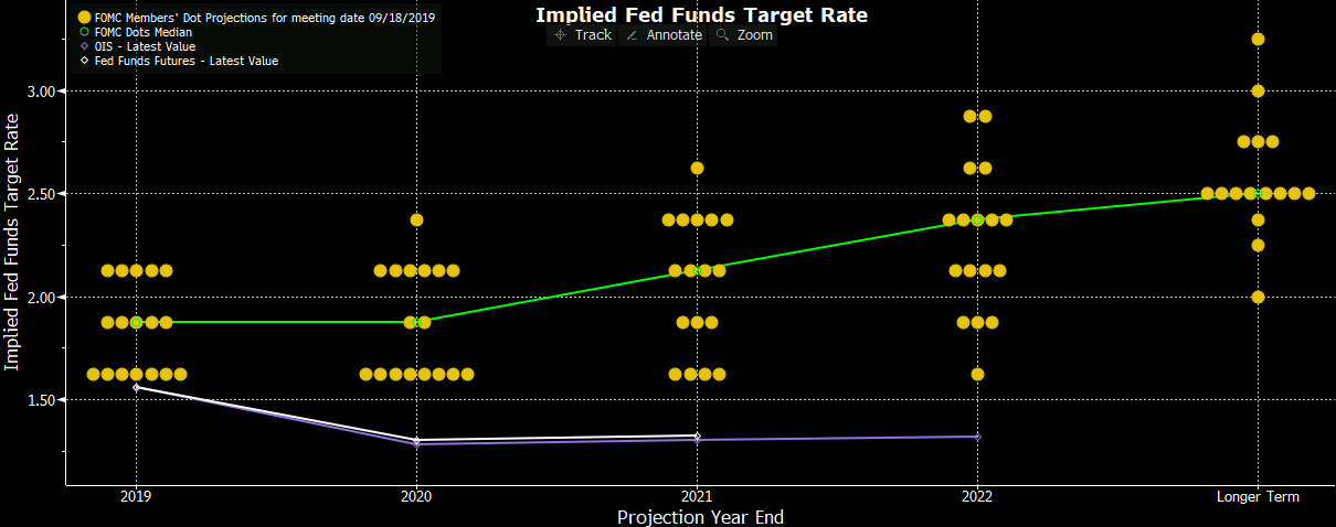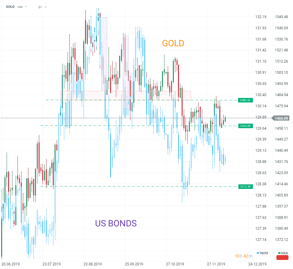 Tečkový graf ukazuje očekávání členů FOMC budoucího pohybu úrokových sazeb. Je publikován kvartálně a ukazuje tak změnu nálady uvnitř Fedu v průběhu dlouhodobějšího časového horizontu. Rok 2019 se blíží ke konci a pozornost se tak soustředí na očekávané dění v letech 2020 a 2021. Z aktuálního (zářijového) grafu stojí za pozornost, že žádný z členů FOMC nečekal další pokles sazeb v příštím roce, zatímco trh se přikláněl k jednomu snížení. Tato očekávání se s novým grafem velmi pravděpodobně změní. Otázkou je, zda se bude jednat o změnu podstatnou. Pokud by se alespoň 3 tečky objevily pod současnými sazbami (1,5 - 1,75 % rozpětí) pro rok 2020, tak by trh viděl rostoucí šance pro reálný pokles sazeb. Takový scénář by zasáhl USD a naopak by byl pozitivní pro zlato a akcie.