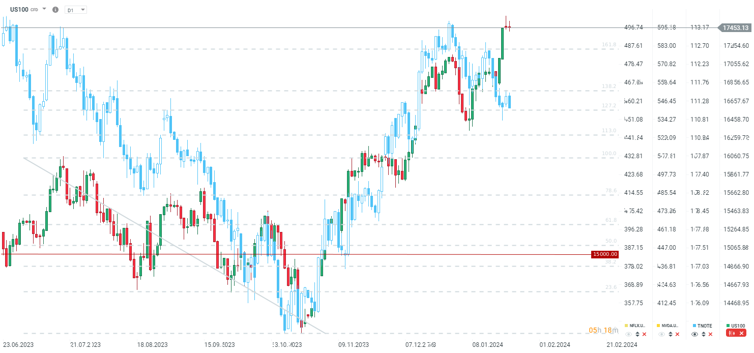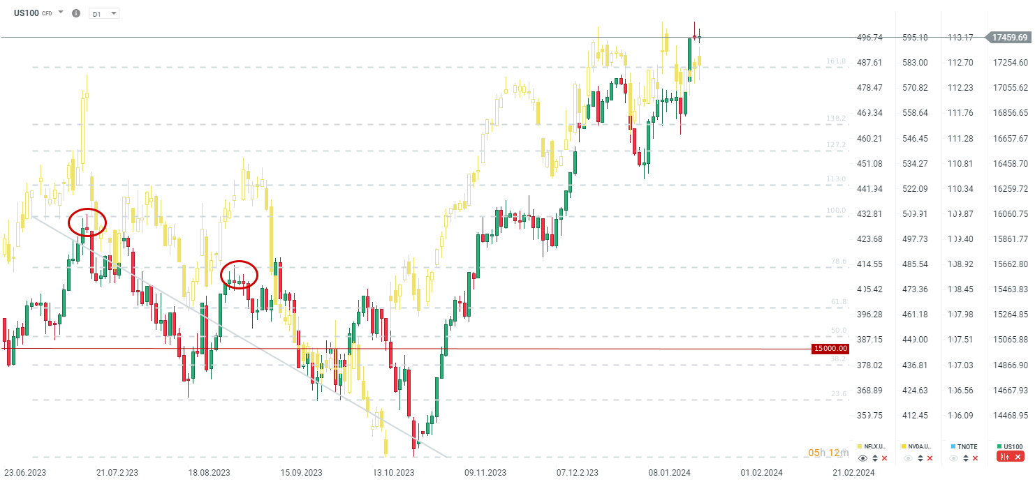 Ako vidno, z technického hľadiska sme svedkami formovania klesajúcej trendovej formácie a okrem toho sme svedkami ďalšieho rastu výnosov. Vidíme veľkú divergenciu medzi US100 a výnosmi, hoci zároveň vzhľadom na dobré výsledky Netflixu nemožno vylúčiť pokračovanie súčasného rastového trendu.