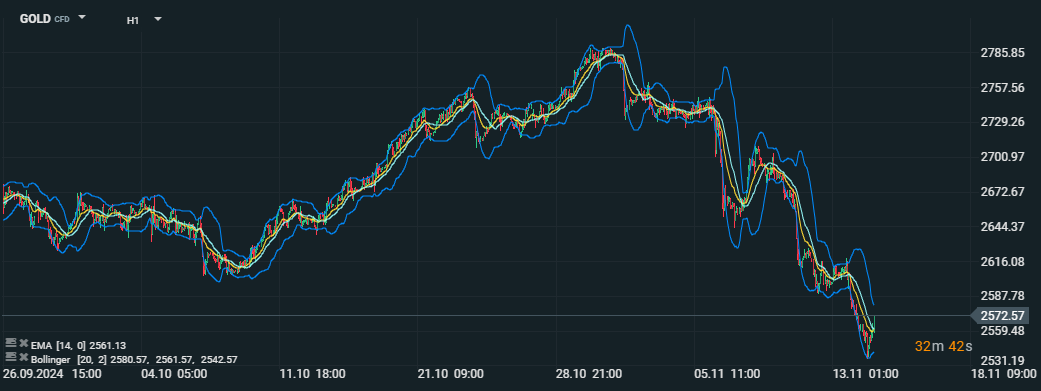 Futures na zlato prudko klesajú, ceny sa blížia k 2 559 USD, trh sa sústreďuje na silnejší dolár a rastúce výnosy; Bollingerove pásma a EMA naznačujú pokračujúci medvedí trend. Zdroj: xStation5