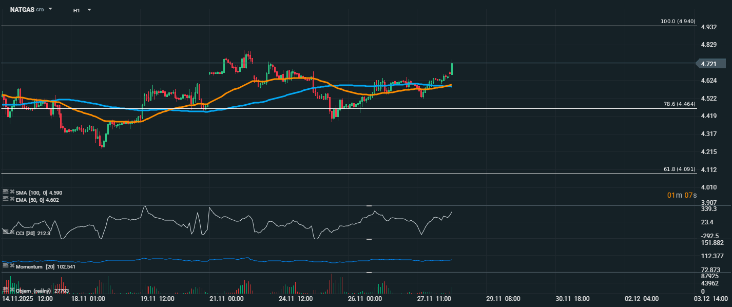 Cena zemného plynu prerazila nad 4,72 USD a nachádza sa nad kĺzavými priemermi EMA 50 (4,602 USD) a SMA 100 (4,590 USD), čo potvrdzuje pozitívny trend. Oba priemery smerujú nahor a vytvárajú podporu pod aktuálnou cenou. Dôležitú úlohu zohrala aj Fibonacciho hladina 78,6 % na úrovni 4,464 USD, ktorú trh predtým úspešne otestoval a následne sa odrazil. CCI dosahuje vysokú hodnotu 212,3, čo signalizuje prekúpenosť trhu, no zároveň potvrdzuje silný nákupný impulz. Momentum je na hodnote 102,5 a rastie, čo ďalej podporuje pokračovanie rastu.