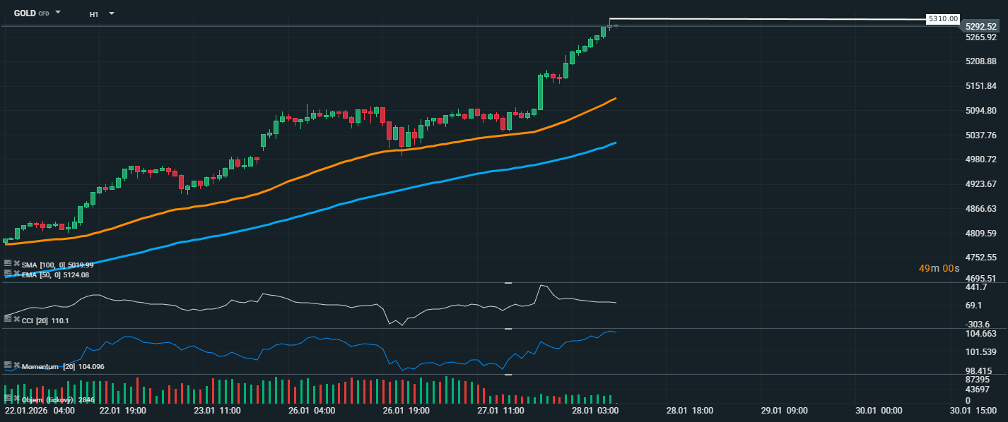 Cena zlata zaznamenala v posledných dňoch prudký a nepretržitý rast a dosiahla nové historické maximum 5 310 USD za uncu. Graf ukazuje jasný silný býčí trend, podporený cenou, ktorá sa dlhodobo drží nad kĺzavými priemerkami – EMA 50 (5 124,02 USD) a SMA 100 (5 019,97 USD). CCI dosiahol hodnotu 110, čo naznačuje prekúpený trh, a momentum tiež dosahuje veľmi vysoké hodnoty (104,096), čo potvrdzuje agresívny nákupný tlak. Objemy obchodovania sa počas prelomov zvýšili, čo naznačuje silný záujem investorov. Cena vzrástla bez výraznejších korekcií, čo zvyšuje pravdepodobnosť krátkodobého spomalenia alebo realizácie ziskov.