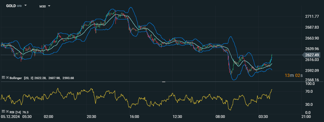 Ceny zlata sa stabilizujú okolo úrovne 2 627 USD za uncu, pričom Bollingerove pásma ukazujú zvýšenú volatilitu a RSI (14) naznačuje prekúpený trh. Zdroj: xStation5