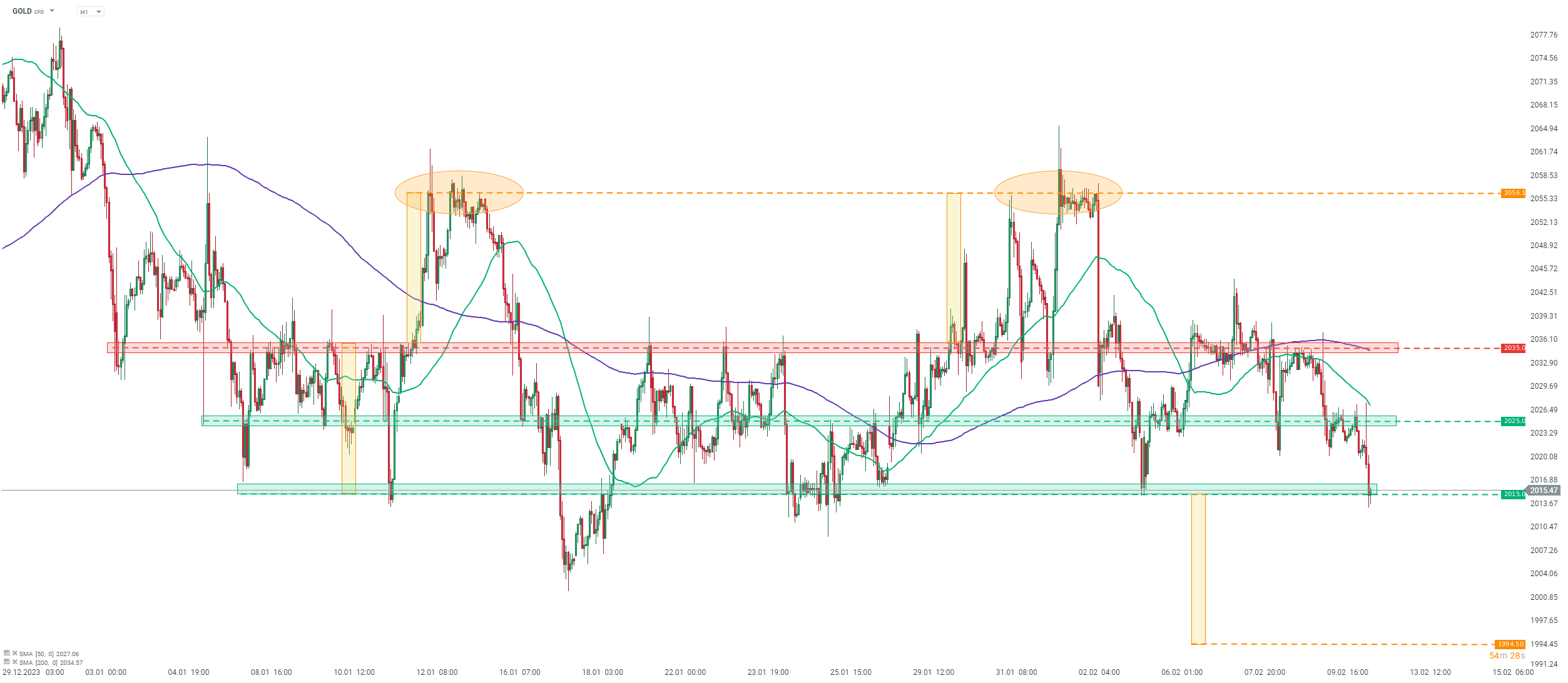 Vzhľadom na to, že cena sa po každom prelomení neustále odkláňa smerom k obchodnému rozpätiu 2 015 – 2 035 USD, môže byť potrebný silný katalyzátor na trvalejší prelom. Takýmto katalyzátorom by mohli byť údaje US CPI za január, ktoré sú naplánované na zajtra o 14:30.
