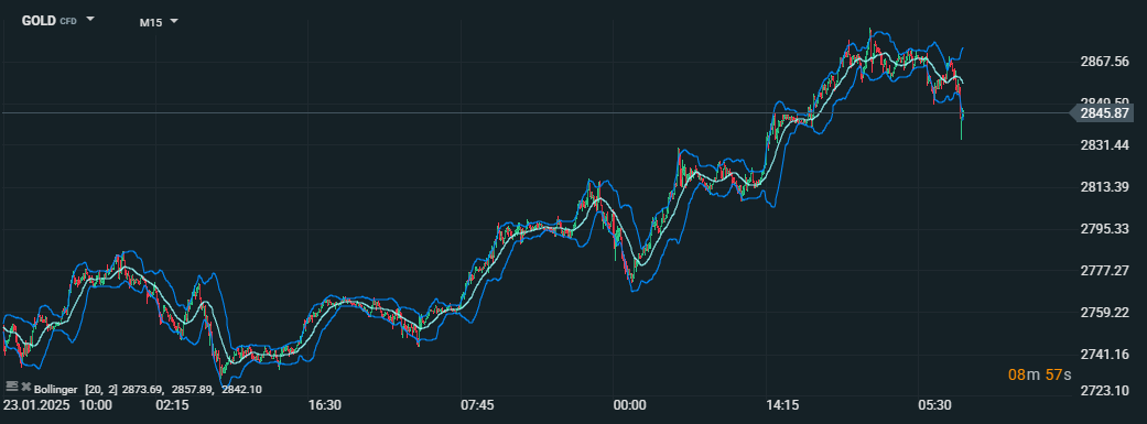 Zlato dosiahlo 2867,56, potom mierne kleslo v dôsledku makroekonomickej a geopolitickej neistoty. Bollingerove pásma naznačujú vysokú volatilitu, keďže investori vyhľadávajú bezpečné aktíva uprostred obchodných sporov. Vyhlásenia prezidenta Trumpa o obnove Gazy podporili rast zlata, ktoré môže čoskoro prekonať 3 000 USD. Zdroj: xStation5