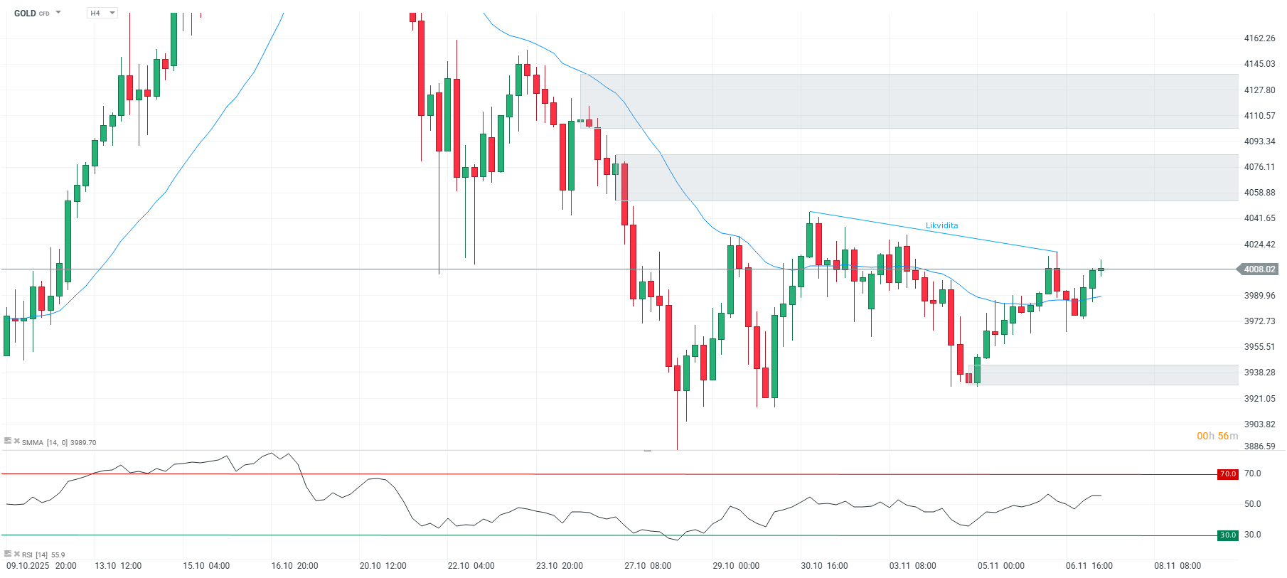 Cena zlata opäť vystúpila nad hranicu 4 000 USD za uncu. Nové štatistiky spoločnosti Challenger, Gray & Christmas ukázali, že americké spoločnosti v októbri ohlásili najviac prepúšťaní za viac ako 20 rokov. Tento vývoj viedol k najprudšiemu poklesu výnosov 10-ročných štátnych dlhopisov za posledný mesiac, čo zvýšilo atraktívnosť zlata ako bezúročného a bezpečného aktíva.