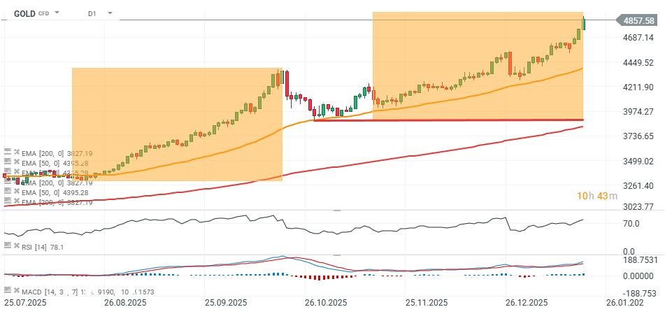 Otázkou zostáva, ako dlho a ako vysoko môže aktuálna rally pokračovať. Denný RSI sa pohybuje blízko hodnoty 80, čo výrazne naznačuje, že sa zlato blíži do prekúpenej zóny. Z pohľadu cenového vývoja by prípadná korekcia mohla stlačiť cenu späť k 4 400 USD za uncu, kde sa nachádza 50-dňový exponenciálny kĺzavý priemer (EMA50, oranžová línia). Tento scenár by zároveň uzavrel korekčný pohyb 1:1, keďže podobný pokles nastal vo 4Q 2025. Nie je možné s istotou povedať, či tento impulz dosiahne 5 000 USD, no ak bude súčasné momentum podobné letu–jeseni 2025, rally by sa mohla zastaviť pri 4 900 USD, s možným návratom k 4 400 USD.