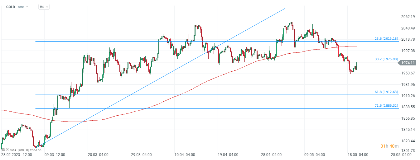 Graf GOLD (interval H4). Zlato se obchoduje v blízkosti rezistence na úrovni 1975 USD za unci - vyznačené 38,2 Fibonacciho retracementem. Proražení výše může předznamenat růst do oblasti 2000 dolarů - psychologické hladiny, kde vidíme hlavní zónu odporu - SMA200 (červená linie). Zdroj: xStation5