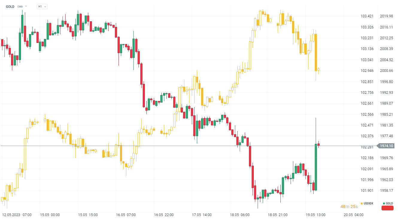 Během Powellova projevu investoři vyprodávali americký dolar a riziková aktiva v očekávání - podle komentáře šéfa Fedu - bude mnoho dalších škod, které restriktivní politika Fedu pravděpodobně "napáchá" na ekonomice. Dolar byl dále oslabován zmenšujícím se "prostorem pro růst" restriktivní politiky Fedu, který musí být opatrnější, aniž by chtěl přehnat restriktivitu současné politiky. Powell zdůraznil, že klíčem k dalším pozorováním Fedu bude trh práce. To znamená, že Federální rezervní systém by rád viděl nárůst nezaměstnanosti, pokles mezd nebo menší poptávku po pracovnících - což vyvolává obavy z recese. Kromě toho zlato podpořily i republikány potvrzené mediální zprávy o pozastavení jednání o dluhovém limitu.