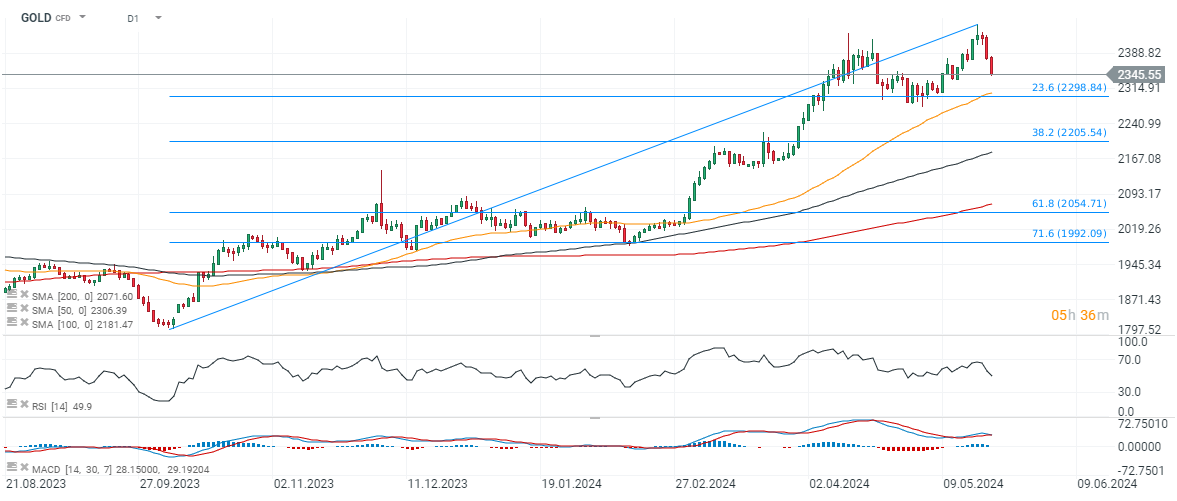Kurzy zlata výrazne strácajú už druhý deň po sebe, čo vyvolali očakávania, že Fed ponechá úrokové sadzby dlhšie nezmenené. Napriek tomu treba pripomenúť, že nedávne historické maximá na zlate boli okrem iného spôsobené Powellovým holubičím slovníkom počas posledného rozhodnutia, ktorý bol posilnený správou o inflácii. V súčasnosti sa už takmer 2/3 májového pohybu znížili. Slabší údaj o aktivite v regióne Chicaga bol čiastočne kompenzovaný silnejším než predpokladaným údajom z Kansasu.