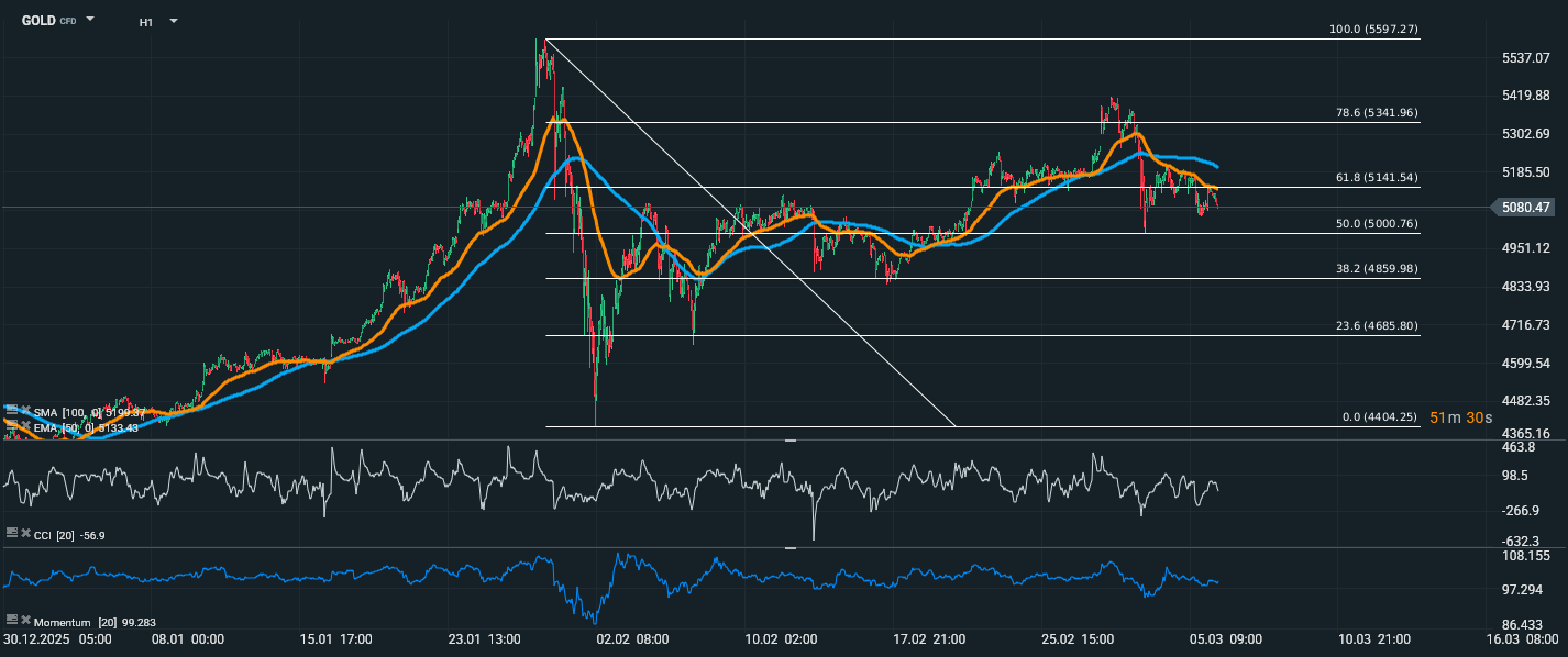 Zlato sa obchoduje blízko 5 080,47 USD a po predchádzajúcom raste sa dostalo do fázy konsolidácie. Cena sa aktuálne pohybuje medzi Fibonacciho úrovňami 50,0 % na 5 000,76 USD a 61,8 % na 5 141,54 USD, pričom práve horná hranica tohto pásma teraz funguje ako najbližšia rezistencia. Trh po skoršom odraze z nižších úrovní nedokázal udržať rast nad pásmom 5 140–5 180 USD a v posledných hodinách je viditeľné slabnúce tempo aj návrat pod krátkodobé kĺzavé priemery. EMA 50 je na 5 133,43 USD a SMA 100 na 5 190,34 USD, takže cena sa teraz drží pod oboma priemermi, čo krátkodobo zhoršuje technický obraz. CCI kleslo na −56,9, čo naznačuje prevahu predajného tlaku, zatiaľ však bez výrazného prepredaného extrému. Momentum sa pohybuje na hodnote 99,283, teda mierne pod neutrálnou hranicou 100, čo potvrdzuje, že býčí impulz momentálne oslabil.