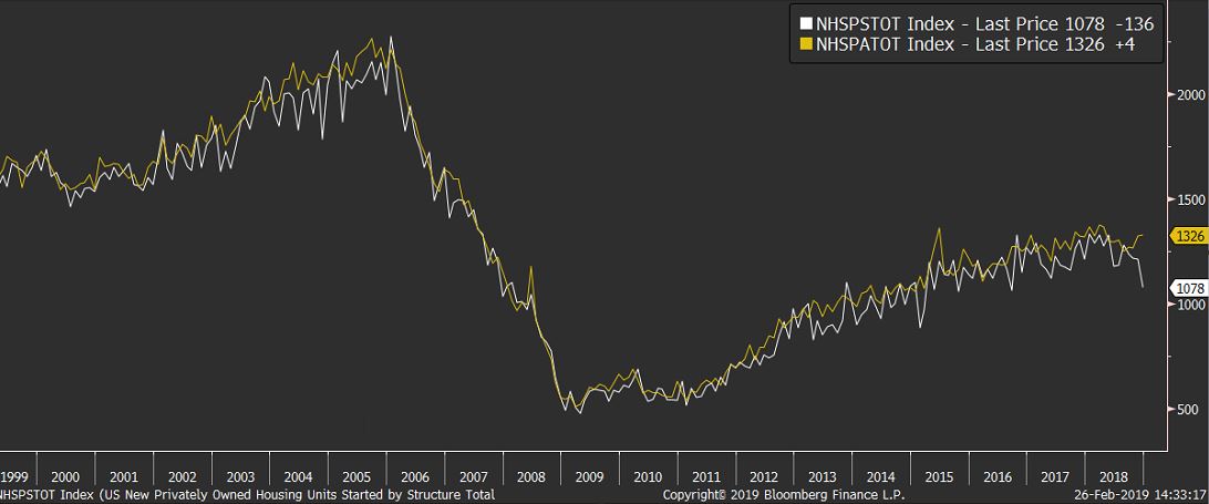 - Začaté stavby domov klesli o 11% na 1,078 mil. anualizovane (čakal sa rast na 1,25 mil.), čo je najnižšia úroveň od septembra 2016. Keď neberieme do úvahy jednorazové výkyvy, tak na takýchto úrovniach sa pohybovali niekedy v prvej polovici roku 2015