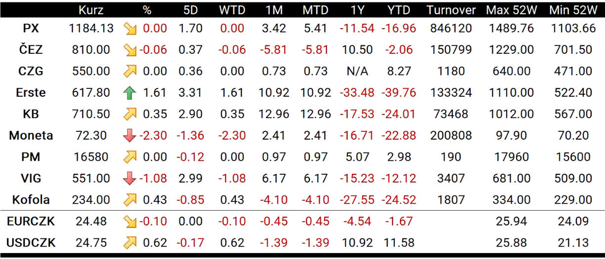 Nejvýkonnějším titulem pražského indexu se dnes stala ERSTE (RBAG.CZ), která si připsala 1,61 % a uzavřela na 617,80 Kč. Nejméně výkonná pak byla Moneta (MONET.CZ), jež odepsala 2,30 % a uzavřela na 72,30 Kč. ČEZ (CEZ1.CZ) se dnes obchodoval více méně do strany a odepsal 0,06 %.