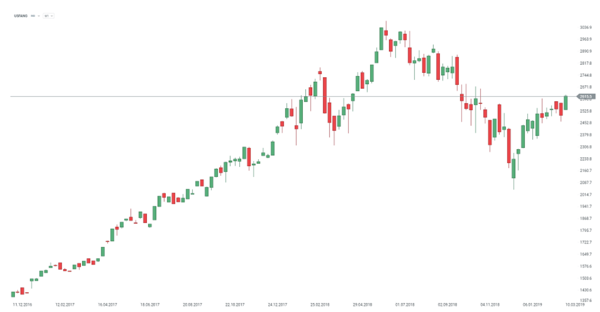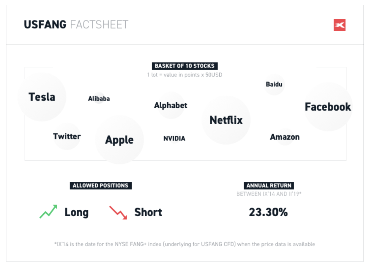 แม้จะมีการแกว่งของกราฟในปี 2018 ดัชนี FANG+ ในตลาดนิวยอร์กยังทำผลตอบแทนประจำปีได้ 23.3% ระหว่างกันยายน 2014 ถึงกุมภาพันธ์ 2019 USFANG เป็น CFD ที่อิงดัชนีนี้ พร้อมให้เทรดบนแพลตฟอร์ม xStation โดยตีมูลค่าเป็นดอลลาร์สหรัฐ ผลตอบแทนอาจเปลี่ยนแปลงตามความผันผวนของสกุลเงิน