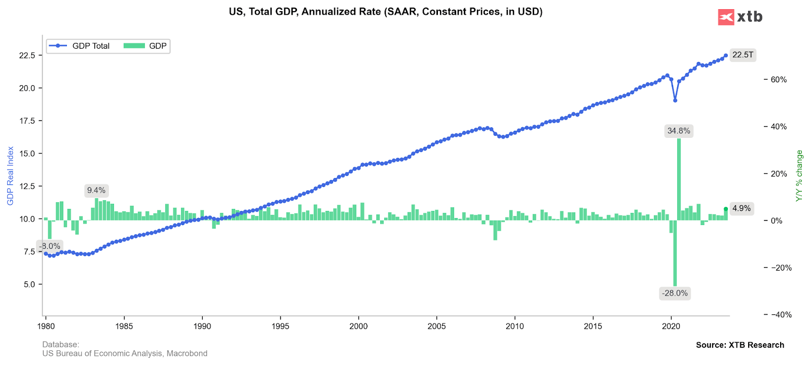 ในระยะยาว ตลาดหุ้นมีความสัมพันธ์กับการเติบโตทางเศรษฐกิจ ดังที่เราเห็นข้างต้น GDP ของสหรัฐฯ กำลังเพิ่มขึ้นตั้งแต่ทศวรรษ 1980 ด้วยอัตราที่น่าประทับใจ เศรษฐกิจที่แข็งแกร่งหมายถึงผู้บริโภคที่มีสุขภาพดีและมีรายได้สูงขึ้น ซึ่งเป็นปัจจัยบวกต่ออัตรากำไรและผลกำไรของบริษัท แม้จะเป็นเช่นนั้น เนื่องจากความผันผวนตามวัฏจักรและเหตุการณ์ที่ไม่สามารถคาดการณ์ได้ บางครั้งหุ้นอาจมีผลการดำเนินงานต่ำกว่าที่คาดและบรรยากาศการลงทุนจะตกต่ำมาก แหล่งที่มา: XTB Research