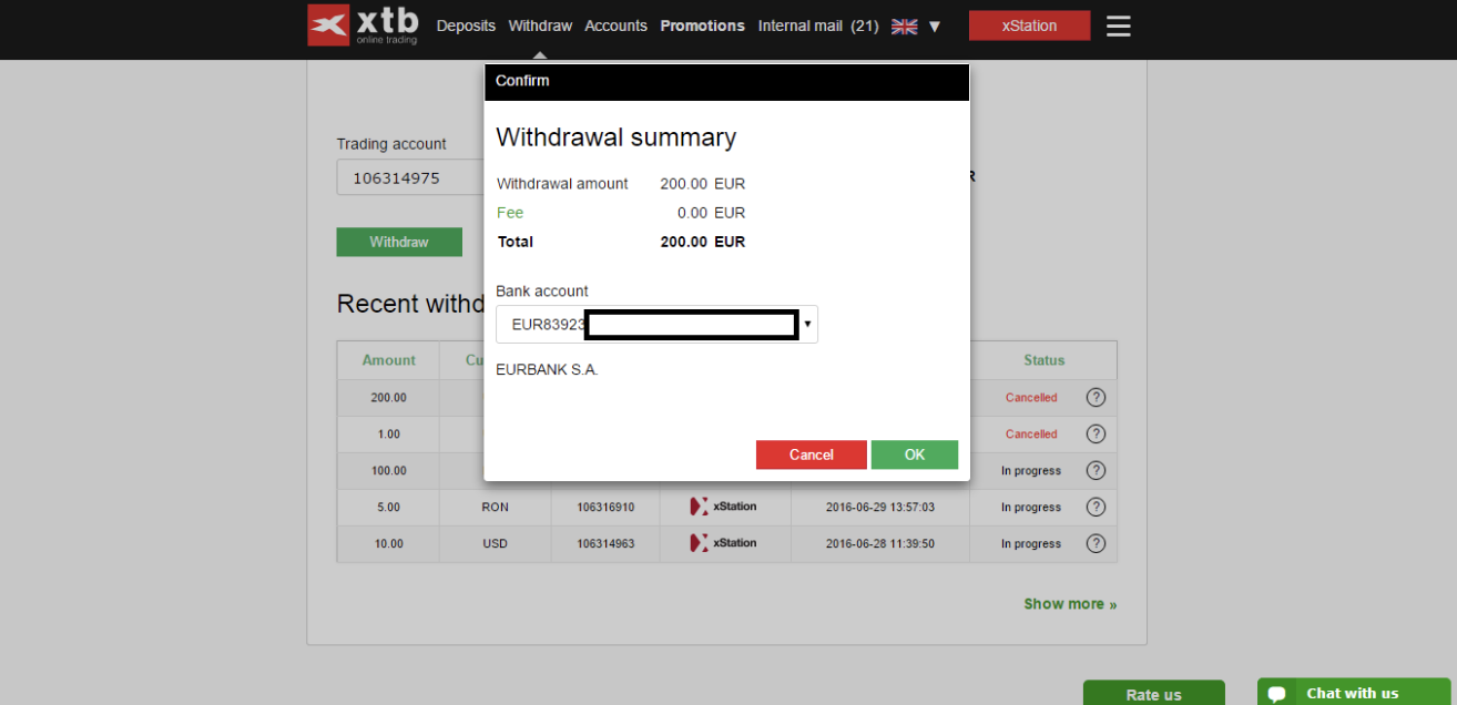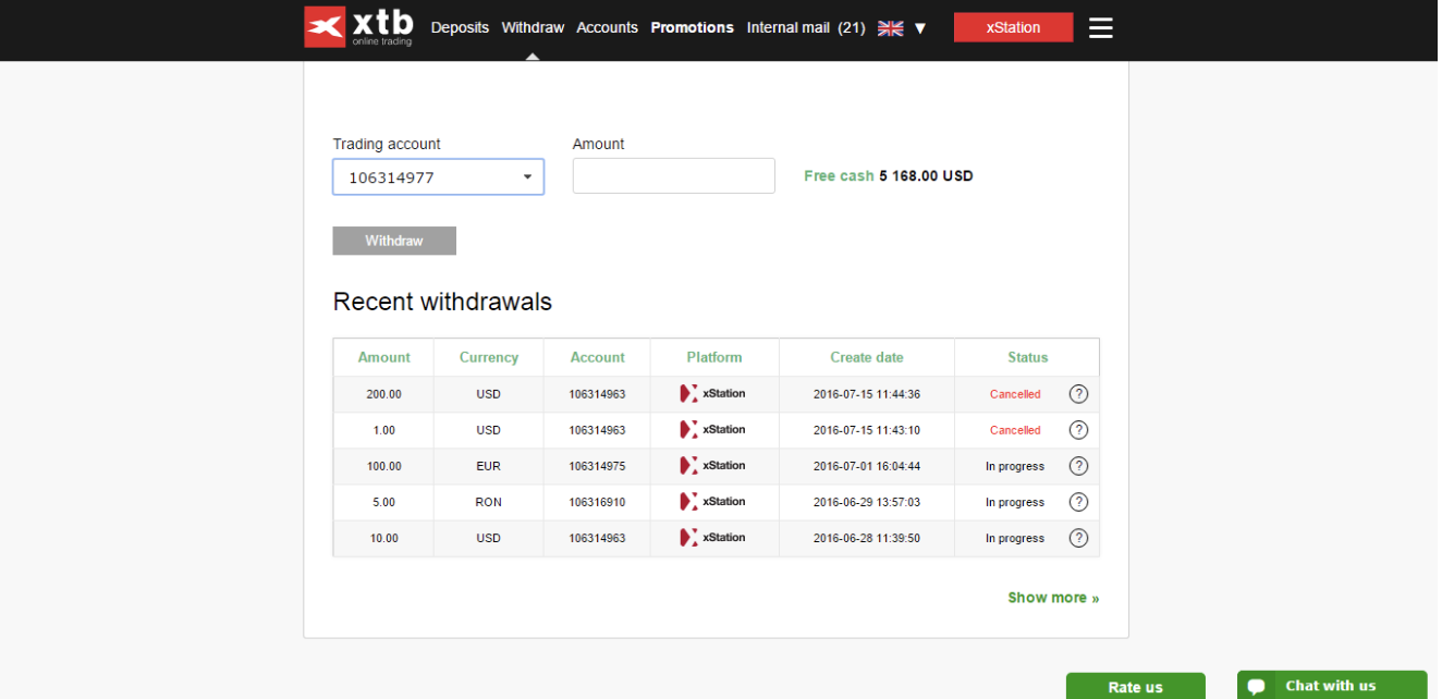 หากคุณต้องการที่จะถอนเงินออกจากบัญชี XTB ของคุณ ขั้นตอนการถอนเงินแบบง่ายๆ เพียงแค่ลงชื่อเข้าใช้ใน xStation หรือ ห้องจัดการบัญชี จากนั้นคลิกแท็บ “Withdraw” (ถอนเงิน)