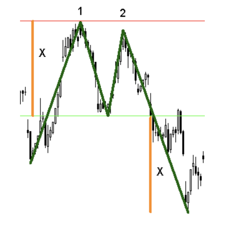 สิ่งที่ควรค่าแก่การจดจำคือรูปแบบราคา Double Top ซึ่งแตกต่างจากเครื่องมือวิเคราะห์ทางเทคนิคอื่นๆ อีกมากมาย ยังสามารถกำหนดเป้าหมายได้ หลังจากการทะลุระดับแนวรับ ตลาดควรลดลงในระยะทางเท่ากับระยะทางที่วัดจากจุดสูงสุดแรกถึงจุดต่ำสุด ซึ่งอยู่ระหว่างจุดสูงสุดสองจุด (ระยะทาง X ในตัวอย่างที่แสดงด้านบน)