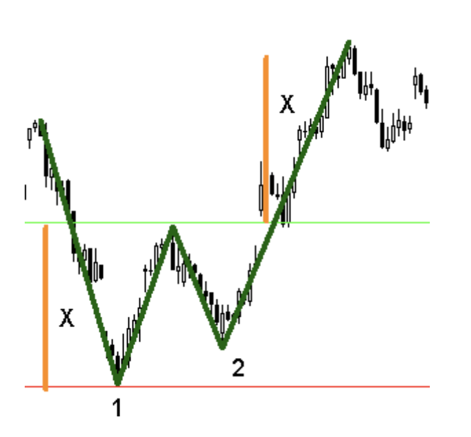 เช่นเดียวกับ Double Top รูปแบบราคา Double Bottom ยังกำหนดเป้าหมายที่อาจเกิดขึ้น หลังจากการทะลุระดับแนวต้าน ตลาดควรเพิ่มมูลค่าในระยะทางเท่ากับระยะทางที่วัดจากจุดต่ำสุดแรกถึงจุดสูงสุด ซึ่งอยู่ระหว่างจุดต่ำสุดสองจุด (ระยะทาง X ในตัวอย่างที่แสดงด้านบน)