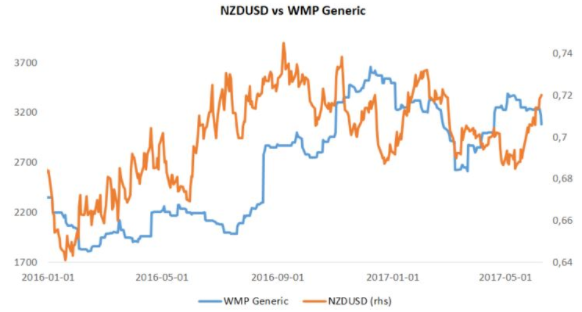 เมื่อราคาของนมสูงขึ้น ทำให้ประเทศที่นำเข้าต้องซื้อเงินดอลล่าร์นิวซีแลนด์เพิ่มขึ้นเพื่อซื้อนมจากพวกเขา เมื่อราคาของนมตก ความต้องการดอลล่าร์นิวซีแลนด์จะลดลง เช่นเดียวกันมูลค่าของมันก็ตกได้ด้วย
