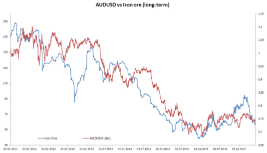 ดอลล่าร์ออสเตรเลียเป็นสกุลเงินสินค้าโภคภัณฑ์ ซึ่งหมายความว่าส่วนใหญ่แล้วความแข็งแกร่งของมันขึ้นอยู่กับราคาของสินค้าโภคภัณฑ์บางชนิด ออสเตรเลียเป็นผู้ผลิตแร่เหล็กที่ใหญ่ที่สุดในโลก ดังนั้นไม่น่าประหลาดใจเลยที่ความมั่งคั่งทางเศรษฐกิจและมูลค่าของเงินตราจะขึ้นอยู่กับสภาพของแร่เหล็ก ดังนั้นแนวโน้มสำหรับสินค้าโภคภัณฑ์นี้อาจถูกนำมาใช้เป็นตัวแทนสำหรับแนวโน้มของดอลลาร์ออสเตรเลีย