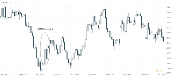 อย่างไรก็ตาม Fed (ธนาคารกลางของสหรัฐอเมริกา) ตัดสินใจ ณ ที่การประชุม ที่จะไม่ส่งสัญญาณนโยบายแบบเหยี่ยว ซึ่งจะบังคับให้เทรดเดอร์ปิดสถานะซื้อเงินดอลล่าร์ของพวกเขา การตัดสินใจนั้นนำไปสู่การลดมูลค่าของเงินสกุลดอลล่าร์อย่างมาก ซึ่งส่งผลให้อัตราแลกเปลี่ยน EURUSD เพิ่มขึ้นจาก 1.05 เป็น 1.10 ภายในระยะเวลาน้อยกว่า 3 ชั่วโมง อย่างที่แสดงอยู่ในแผนภูมิด้านล่าง