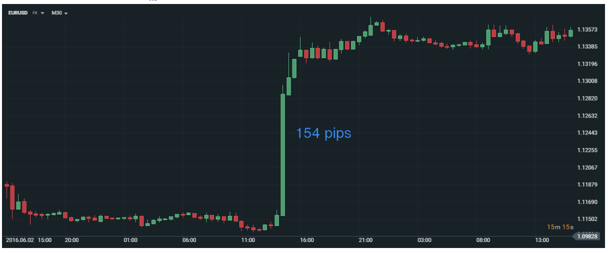 ในตัวอย่างด้านบน เราจะเห็นปฏิกิริยาของ EURUSD ต่อรายงาน NFPs ในเดือนมิถุนายน 2016 ตลาดถูกคาดการณ์ไว้ว่าจะมีจำนวนของการจ้างงานใหม่ประมาณ 159,000 ตำแหน่ง ในอุตสาหกรรมนอกภาคเกษตรในเศรษฐกิจสหรัฐอเมริกา ในขณะที่จำนวนการจ้างงานจริงนำไปสู้ความประหลาดใจที่น่าผิดหวังที่ 38,000 ตำแหน่งเท่านั้น ผลลัพธ์ที่แย่กว่าค่าจริงเป็นสาเหตุให้เกิดการอ่อนตัวของเงินสกุลดอลล่าร์เทียบกับยูโร โดยตลาดสกุลเงิน EURUSD เพิ่มมูลค่า 154 ปิป ภายใน 30 นาที