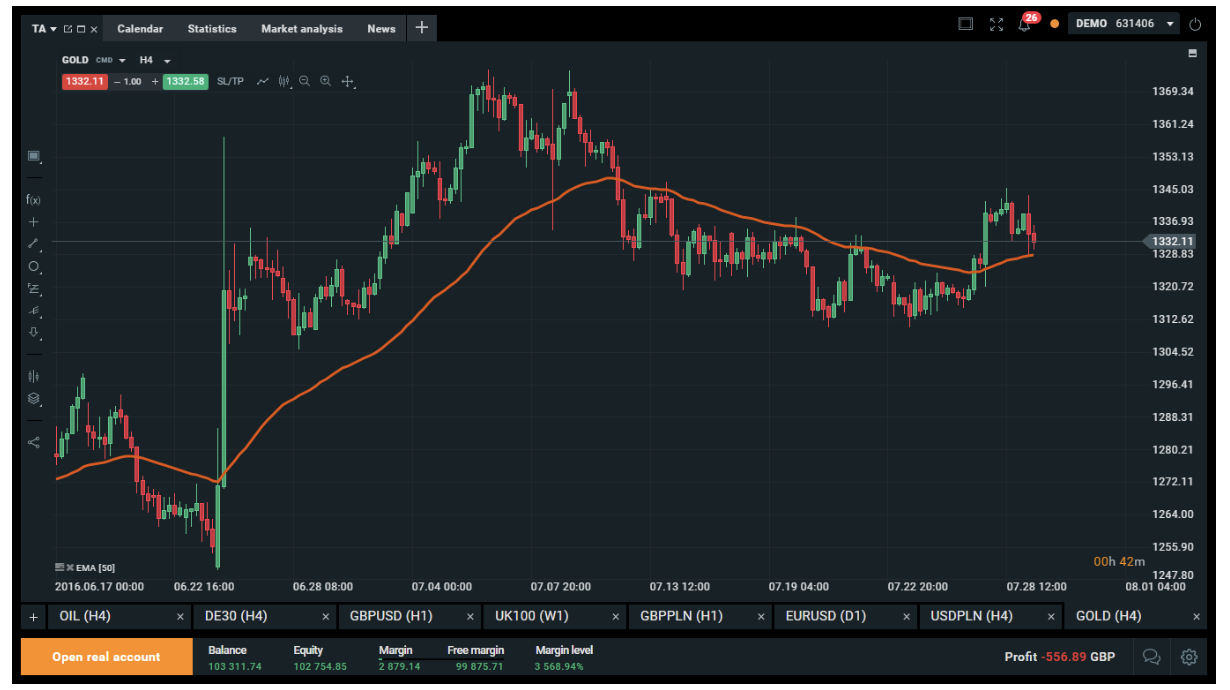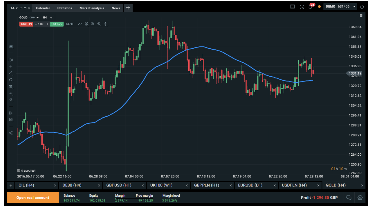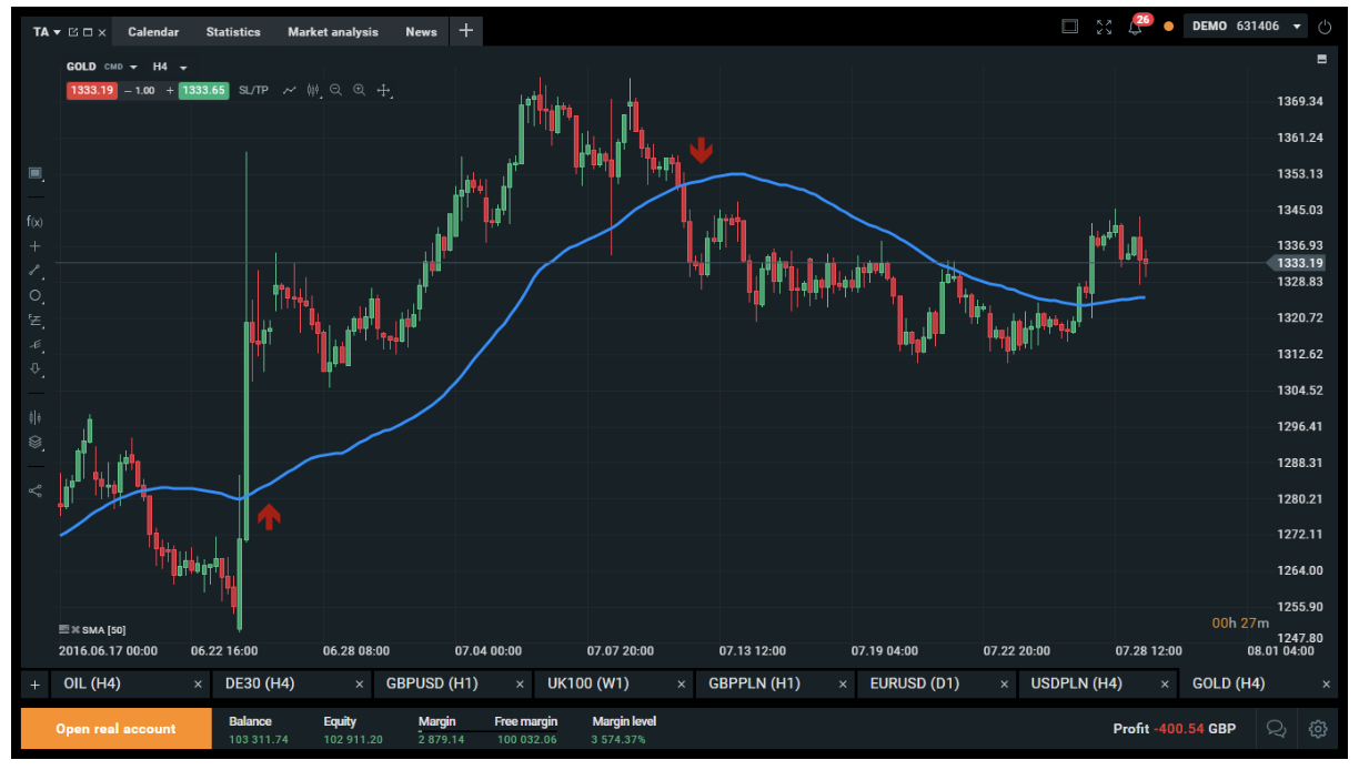 ในตัวอย่างด้านบน ช่วงระหว่าง 50 SMA ถูกใช้สำหรับแผนภูมิของตลาดสินค้าประเภททอง อย่างที่คุณเห็น ตลาดให้สัญญาณการซื้อ หลังจากที่มูลค่าของตลาดเพิ่มสูงขึ้น หลังจากนั้นระดับราคาของตลาดฝ่า SMA จากด้านบน ซึ่งทำให้สัญญาณการขายปรากฏขึ้นมา หลังจากที่มูลค่าของตลาดลดลง