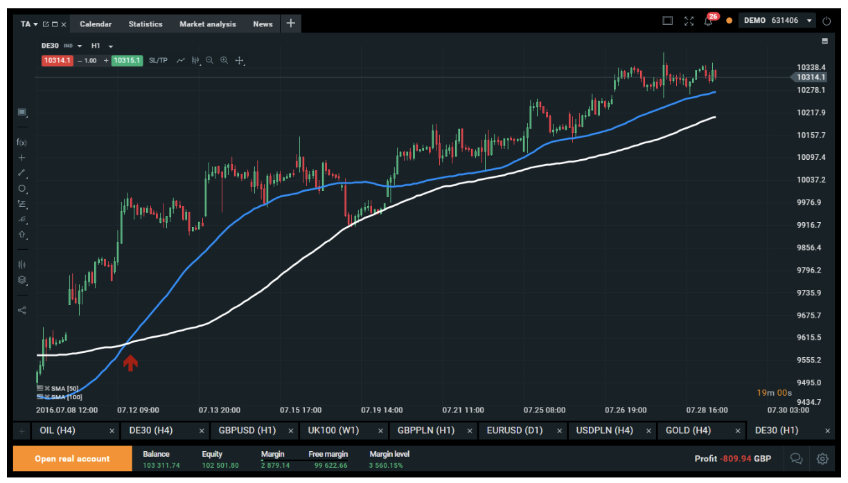 ในตัวอย่างด้านบน ช่วงระยะเวลา 50 ของ SMA (เส้นสีฟ้า) และ ช่วงระยะเวลา 100 ของ SMA (เส้นสีขาว) ถูกใช้สำหรับสินค้าในตลาด DE30 จะมีการให้สัญญาณขาย เมื่อเส้นแนวโน้มช่วงระยะเวลา 50 ของ SMA ฝ่าเส้นแนวโน้มช่วงระยะเวลา 100 ของ SMA จากด้านล่าง หลังจากที่มีการเพิ่มมูลค่าของตลาด