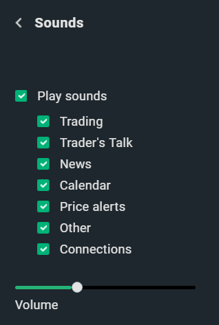 หากคุณต้องการ คุณสามารถเริ่มใช้งานฟีดเสียง ที่ช่วยเตือนคุณเมื่อมีข่าวด่วนเกี่ยวกับตลาด เพื่อเริ่มใช้งานเเบบเสียง เพียงกดที่ปุ่มเล่น และปรับเปลี่ยนระดับความดังของเสียงตามความต้องการของคุณ อย่าลืมตรวจสอบว่าคุณเปิดเสียงไว้บนคอมพิวเตอร์ของคุณ และจำไว้ว่า - Trader’s talk (การพูดคุยของเทรดเดอร์)เป็นเครื่องมือที่ใช้งานได้จริงในบัญชีจริงเท่านั้น