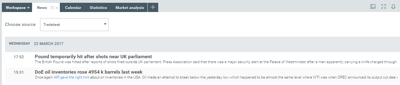 นอกเหนือไปจากปฏิทิน คุณสามารถเข้าถึงแถบของข่าวได้เช่นกัน ซึ่งแถบนี้เป็นแถบที่คุณสามารถดูข่าวด่วน การวิเคราะห์พื้นฐาน การวิเคราะห์ทางเทคนิค และแนวคิดในการเทรด ทั้งหมดนี้อัพเดตตามเวลาจริง เช่นเดียวกันกับการแสดงเหตุการณ์เกี่ยวกับตลาด