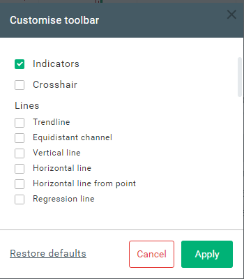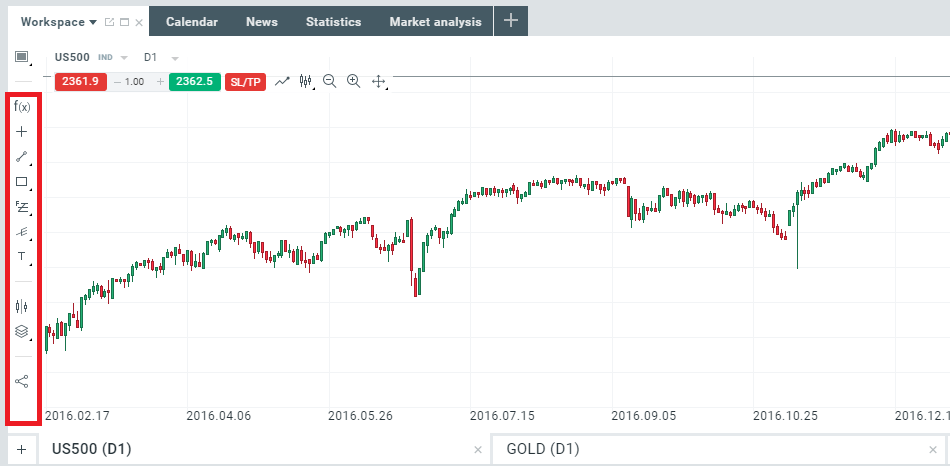 xStation 5 มีเครื่องมือวิเคราะห์กราฟมากมาย เพื่อให้คุณสามารถสร้างกลยุทธ์การซื้อขายขั้นสูงได้ เครื่องมือต่อไปนี้มีให้บริการ: