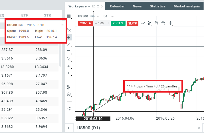 เครื่องหมายกากบาทช่วยให้คุณดูกราฟที่คุณเลือกได้อย่างแม่นยำยิ่งขึ้น และวิเคราะห์องค์ประกอบต่างๆ เช่น ราคาเปิด ปิด สูงสุด ต่ำสุด ในช่วงเวลาที่กำหนด เครื่องหมายกากบาทยังช่วยให้คุณวัดความยาวของการเคลื่อนไหวในหน่วย Pip หรือเวลา และดูจำนวนแท่งเทียนที่ราคาเคลื่อนไหว เพียงกดคลิกซ้ายค้างไว้แล้วเลื่อนเครื่องหมายกากบาท