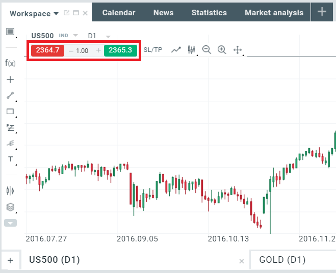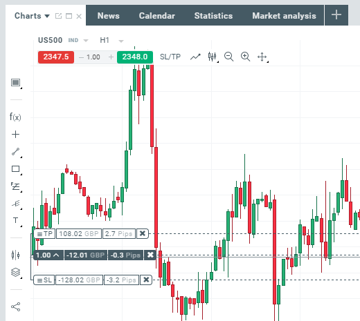 นี่เป็นตัวอย่างในการดำเนินการดังกล่าว อย่างที่คุณก็ได้เห็นไปแล้วว่าถ้าตอนนี้คุณมีแผนภูมิของดัชนี US500 เปิดอยู่ และสำหรับการเป็นตัวอย่าง สมมุติว่าคุณคิดว่าราคาของดัชนีกำลังจะสูงขึ้น ดังนั้นคุณต้องการที่จะซื้อ ในมุมบนด้านซ้าย คุณสามารถที่จะแก้ไขปริมาณของลอตที่สัมพันธ์กับขนาดของสัญญาซื้อขายได จากนั้นคลิกที่ปุ่ม SL/TP และเปิดสวิทซ์เพื่อเริ่มการใช้งาน โดยการเพิ่ม stop loss และในที่สุด ตอนนี้คุณก็พร้อมแล้วที่จะกดซื้อ และยืนยันการเทรด