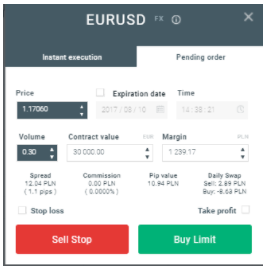 ถ้าคุณคลิกขวาเหนือราคาล่าสุด คุณจะเห็นว่าจะมีคำสั่ง sell limit และ buy limit อยู่ ในทางกลับกัน ถ้าคุณคลิกใต้ราคาล่าสุดคำสั่ง sell stop และ buy limit จะปรากฏขึ้น ถ้าคุณคลิกที่คำสั่งใดคำสั่งหนึ่ง หน้าต่างดังที่แสดงอยู่ด้านล่างจะปรากฏขึ้น ซึ่งคุณสามารถที่จะยืนยันขนาด ราคา และประเภทของการเทรดของคุณได้