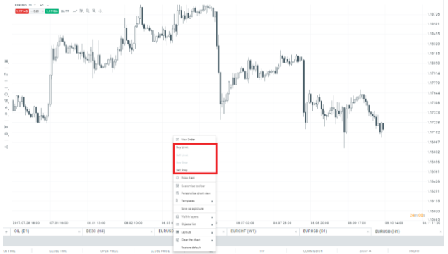 ยังมีอีกวิธีการหนึ่งในการเปิดการลงทุนจากหน้าต่างแผนภูมิ คุณสามารถที่จะคลิกขวาในขณะที่กำลังวิเคราะห์แผนภูมิ จากนั้นหน้าต่างใหม่จะปรากฏขึ้น ในหน้าต่างนี้ คุณจะสามารถเห็นประเภทของคำสั่งที่มีให้ใช้ในการเทรด