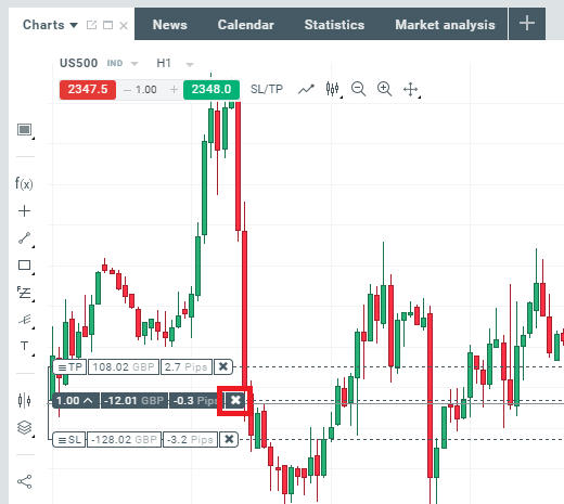 อย่างที่คุณเห็น xStation 5 จะแสดงว่ามีการระยะห่างจากราคาล่าสุดไปยังระดับของ SL and TP เป็นจำนวนกี่ปิป และมูลค่าขึ้นต่ำของปิปโดยอัตโนมัติ คุณสามารถยกเลิก SL หรือ TP ตอนไหนก็ได้ โดยการคลิก ‘x’