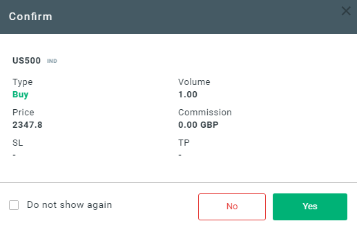 โดยการคลิกที่ปุ่ม ใช่ ในการยืนยันการเปิดสถานะซื้อขาย ถ้าคุณทำเครื่องที่ช่อง ‘Do not show again - ไม่ต้องแสดงข้อความนี้อีก’ จากนั้นกดปุ่ม ใช่ คุณจะปิดหน้าต่างยืนยันทันที ดังนั้นสำหรับการทำคำสั่งซื้อขายถัดไป สัญญาจะถูกวางในตลาดทันที่ หลังจากที่คลิกปุ่ม ซื้อ/ขาย