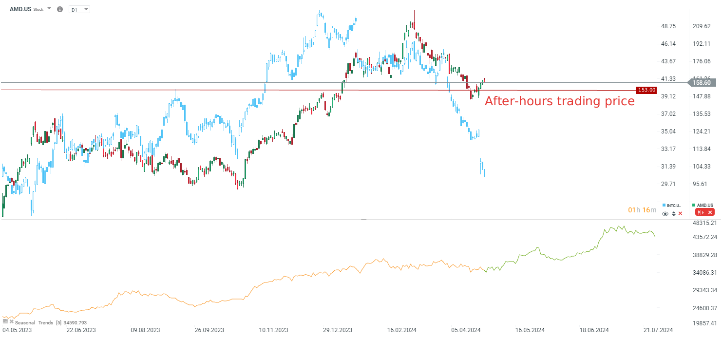 AMD announced results for the first quarter of 2024, which were mostly in line with analyst expectations. The company's revenue was $5.47 billion, up 36% from last year. Earnings per share (EPS) were $0.62, beating expectations of $0.61. On the other hand, the company presents rather mixed guidance. Results in line with expectations and rather weak guidance show that the company is not able to grow like Nvidia at the moment, which may suggest that despite a strong correction, the company's stock declines may not be over yet. AMD loses approximately 3.6% in after-market quotations. Moreover, SMC shows weaker results (mainly in terms of revenues and guidelines), which also worsens the mood in the chip sector.